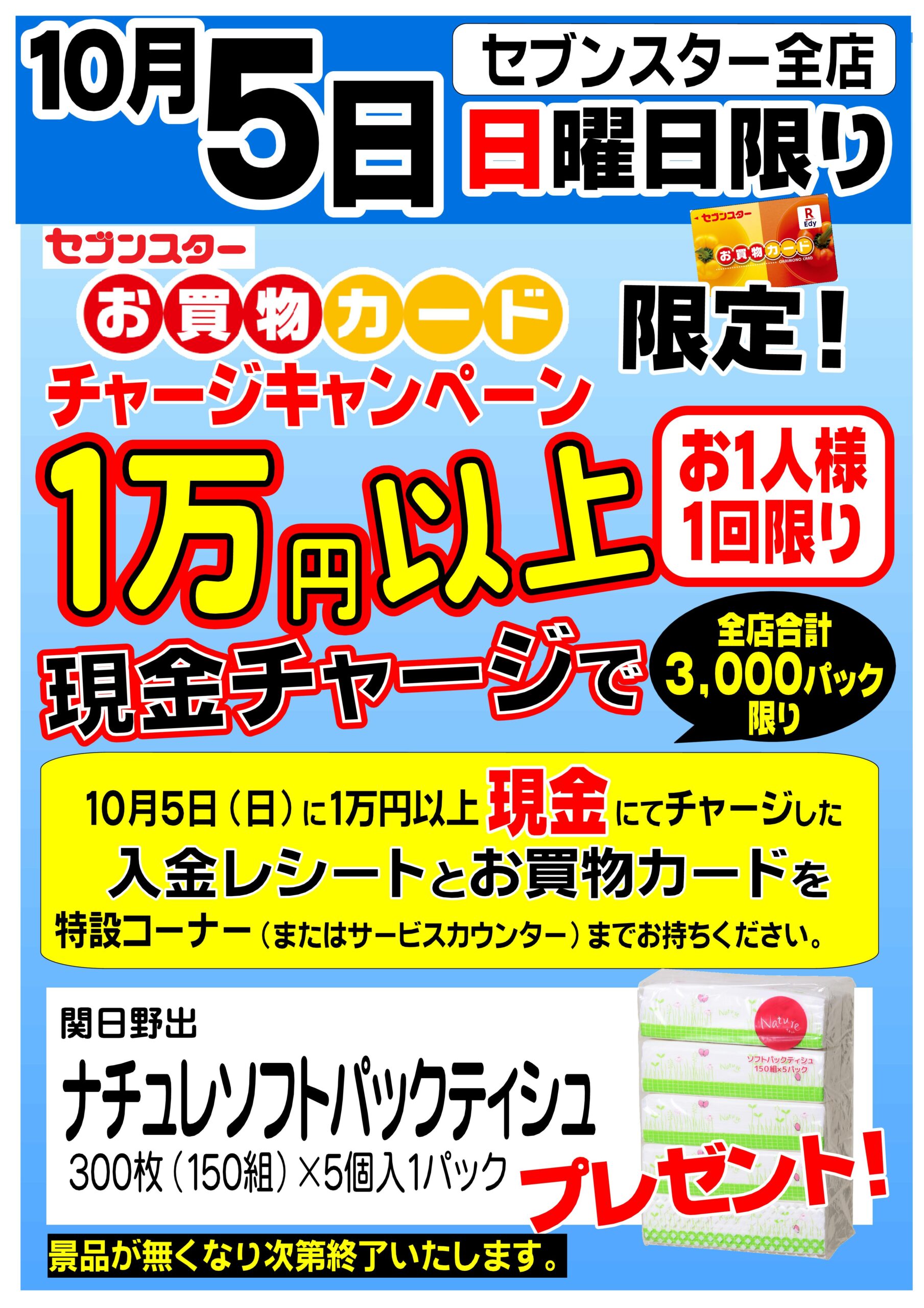 お買物カード限定!チャージキャンペーン【10/5(日)限り】
