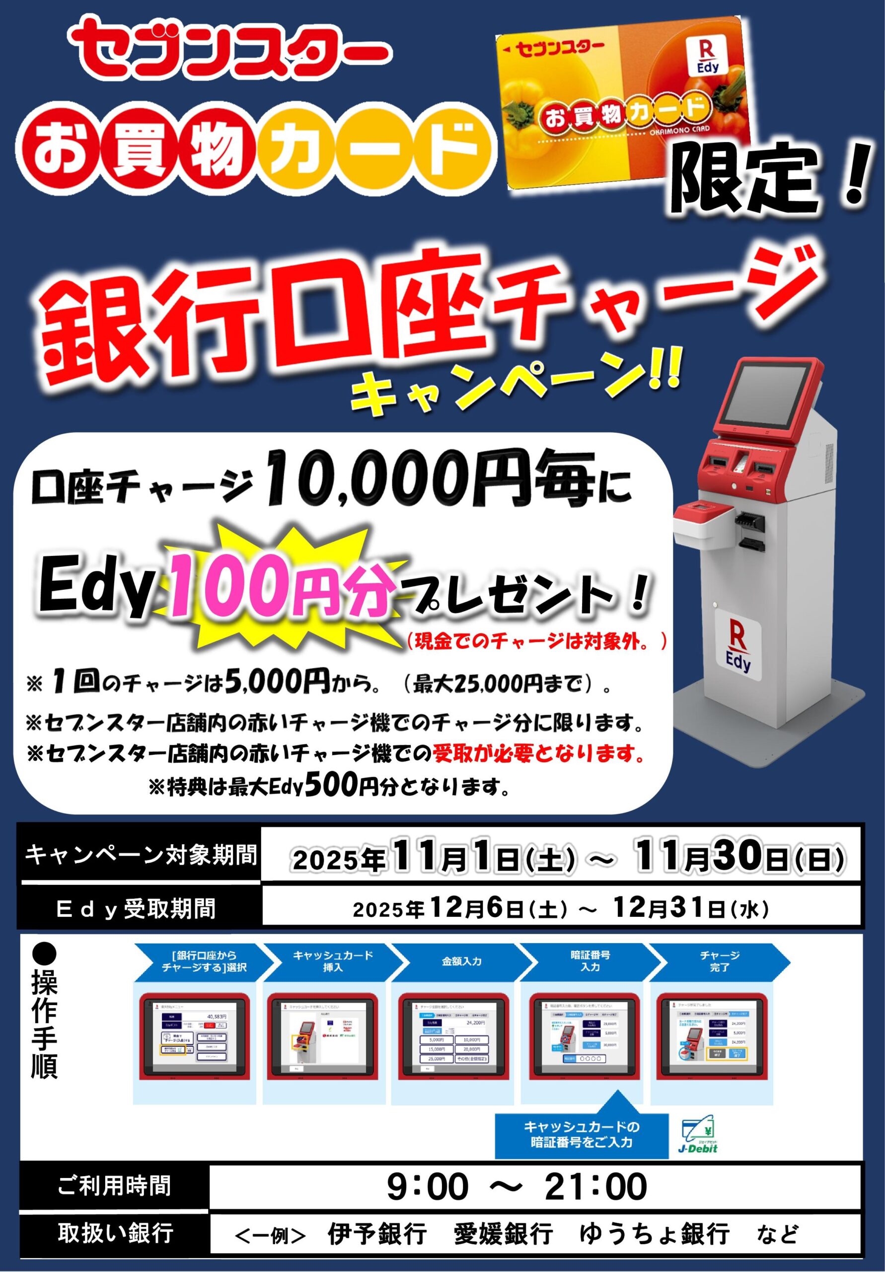 お買物カードに赤いチャージ機からキャッシュカードを使用してチャージいただくと、期間中口座チャージ10,000円毎にEdy100円分プレゼント🎁