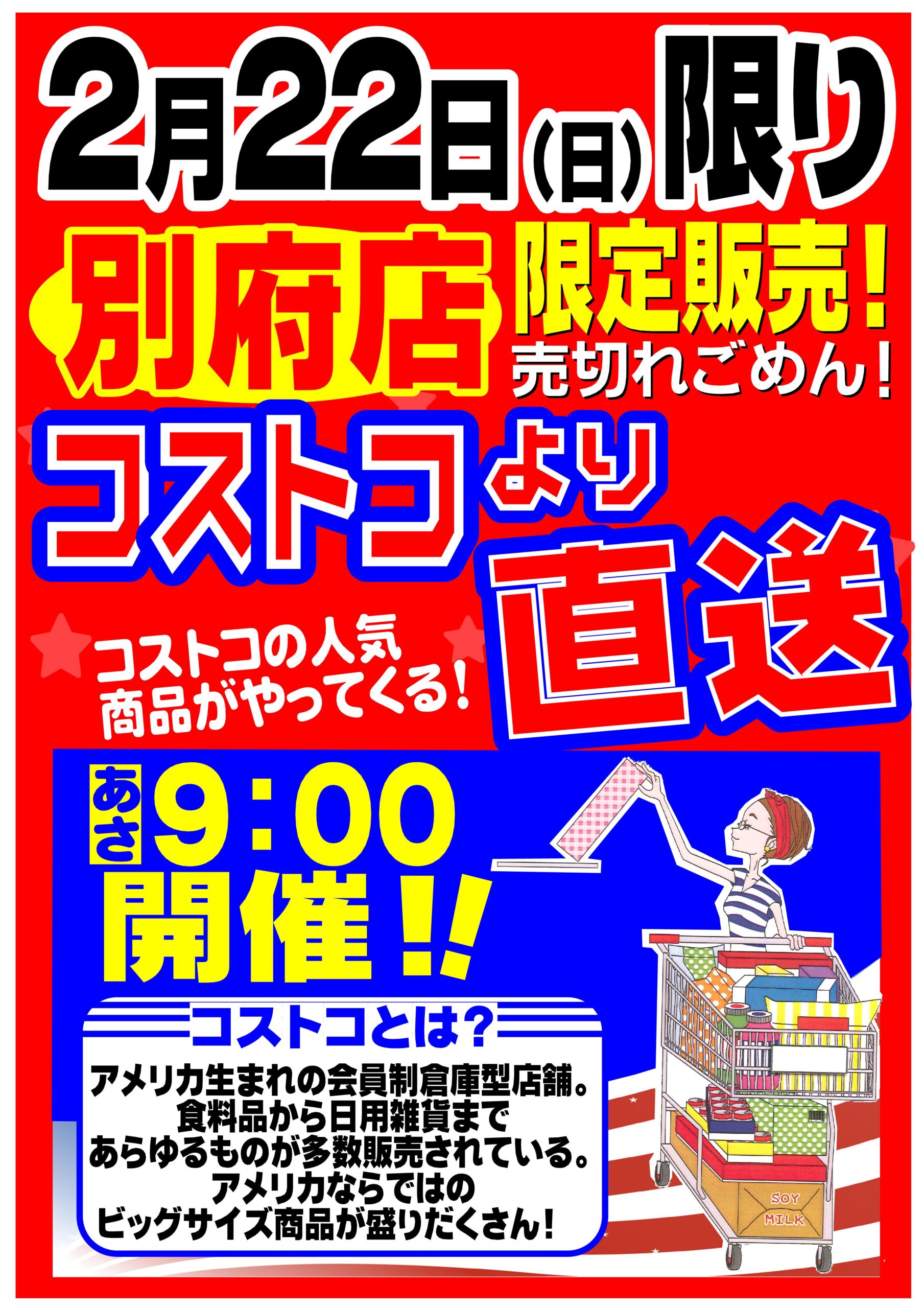 2月22日(日)限り、セブンスター別府店にてコストコより直送した商品を販売いたします。