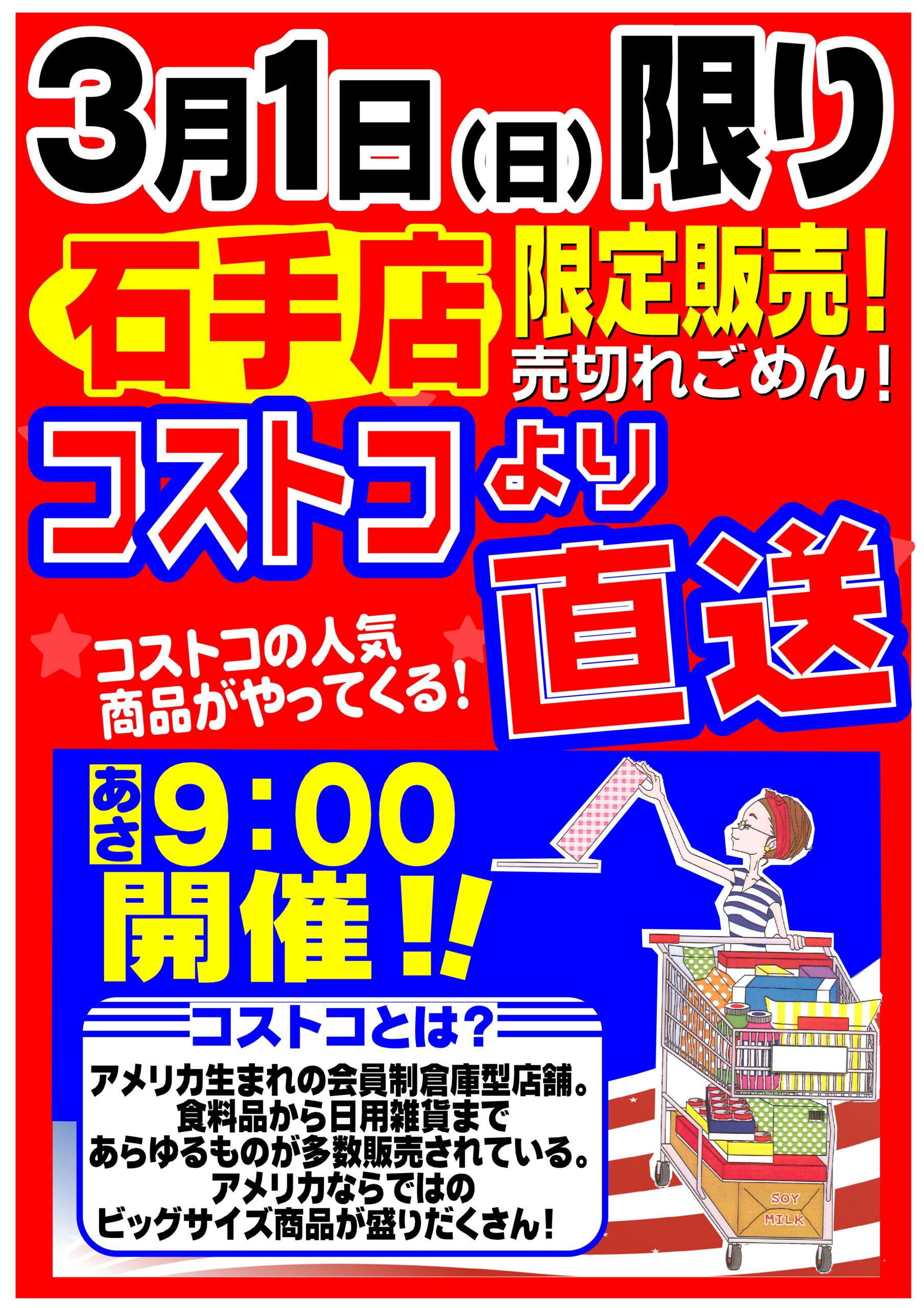 3月1日(日)限り、セブンスター石手店にてコストコより直送した商品を販売いたします。